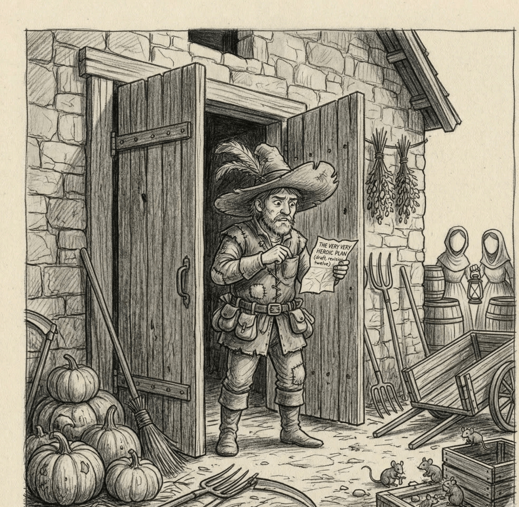 As it turned out, Sloggendorf’s one tavern was also its town hall, panic headquarters, and, on alternate Wednesdays, the site of competitive melancholy recitations. Tonight, however, it was the scene of an even more tragic spectacle: Valerius the Valiant (pending certification and possibly susceptible to drafts) holding a vinegar jug aloft, regaling an overflowing house with tales that bent credibility into balloon animals.