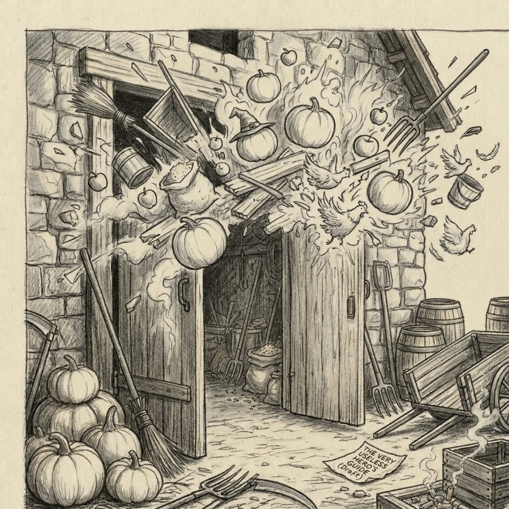 ‘Fantastic! Just what I need—a vessel for fleeing, if only this barn had a river, or an exit less flammable than my dignity!’